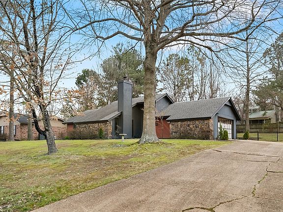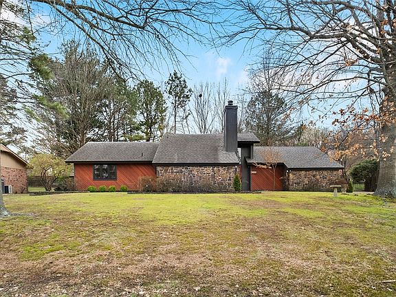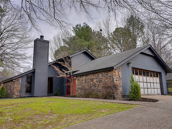 This stunning wood and stone midcentury-style home is situated at the end of a quiet road and nestled among mature trees. Inside, you will be greeted by soaring ceilings, hardwood floors, and slate tile. Thanks to the newly installed windows from 2021, natural light illuminates the space while a wood-burning fireplace creates a cozy center. An open concept allows for a smooth transition from the main living area into two spacious bedrooms. There's a bonus area perfect for a library, home office, or even potentially a third bedroom. This home has so many special touches including a rounded wall in the kitchen, a step-down shower in the primary bathroom, and a backsplash recycle chute from kitchen to garage. Its sweeping landscape is perfect for a backyard party. It's walkable to Lake Fayetteville and the disc golf course, as well as the Razorback Greenway for biking. It's a 5 minute drive to Tyson HQ and just 10 minutes to downtown Fayetteville and the UofA campus. Video link walk through provided upon request