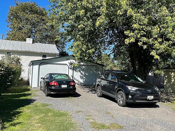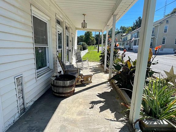 This is not a duplex. Two front doors lead to single family home. Beautifully up dated and charming. The house is freshly painted throughout. Signs of the past mixed with convenience of modern living. New HVAC system in 2019 with warranty. updated windows. Welcoming living room joining formal dining room with nice pellet stove. Convenient kitchen with pantry and eat in accommodations. First floor half bath and second floor has three bedrooms and full bath. Outside is very livable with patio for entertaining and pool for fun and games. Backyard is fully fenced and private. Over-sized garage with plenty room for storage and workshop. Plus two storage sheds on spacious yard. Come look and enjoy. Dogs in garage and cat in house please do not let out.