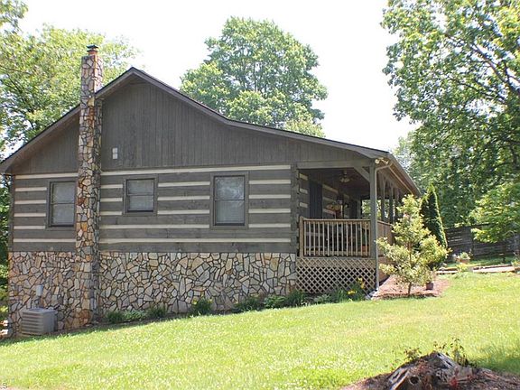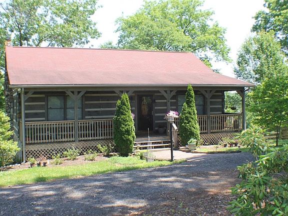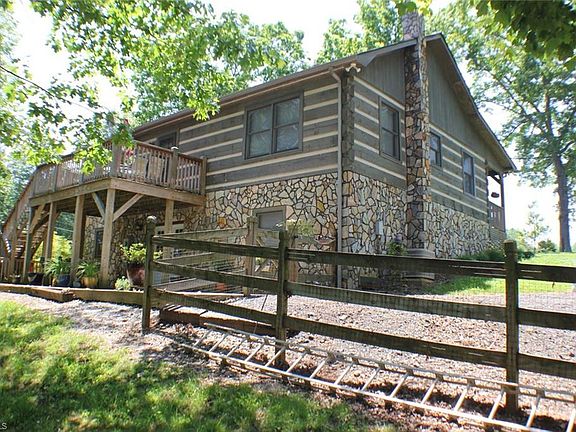 Quiet country setting is the lovely log home with covered front porch, new deck on back. open living-dining-kitchen and 2 br. on main level. full basement with one room and one bath. Detached storage building, fenced area, garden space, patio, on over 3 acres.