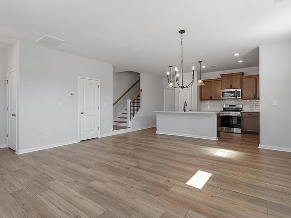 Welcome to the Renaissance at White Oak community, an exemplary lifestyle destination featuring outstanding amenities such as a swimming pool, playgrounds, parks, a dog park, and scenic walking paths. This spacious two-story townhome includes a substantial two-car garage and an open-concept layout that seamlessly connects the family room. The eat-in kitchen is designed with timeless burlap-colored cabinetry and elegant white quartz countertops, creating a sophisticated space for gatherings. On the upper level, hardwood stairs and metal railings enhance the home's elegance. The primary suite offers a boxed ceiling, dual closets, and dual sinks for convenience, while two additional bedrooms share a nearby bathroom for privacy. This represents an exceptional opportunity to acquire a home that balances charm and functionality within a thriving community.