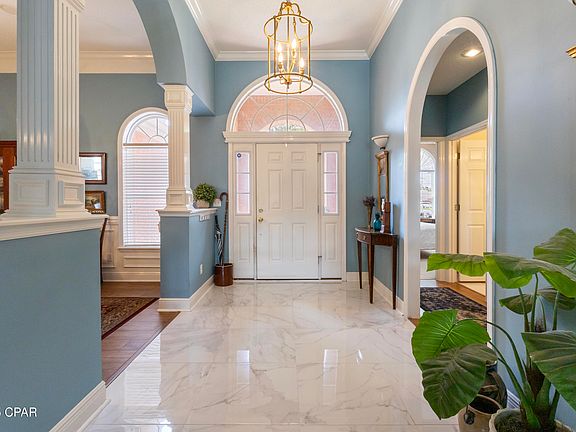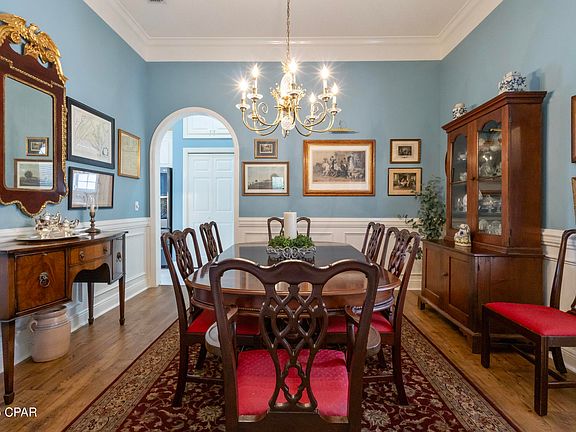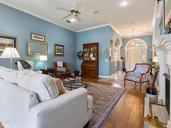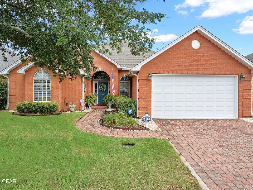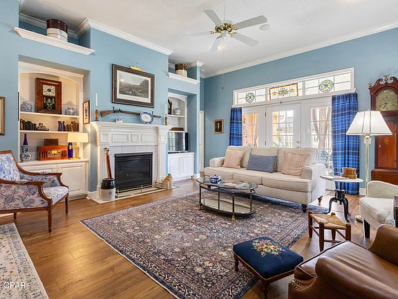 Welcome to this beautifully maintained 3-bedroom, 2-bathroom home in the desirable Harrison Place neighborhood. Featuring a split-bedroom layout and a semi-open floor plan, this home offers both privacy and flow. High ceilings, luxury trim, and rich Virginia Hickory LVP flooring set the tone for elegance, while carpet in the bedrooms adds comfort. The kitchen is a true chef's delight, offering ample counter and cabinet space, a breakfast bar, a vibrant tiled backsplash, smart appliances, a gas stove, and a convenient pantry. Two dining areas provide flexibility for both casual meals and entertaining. The living room features custom built-ins, decorative niches, and a cozy gas fireplace. The master suite boasts a large walk-in closet and a luxurious bath with a double vanity, separate shower, and relaxing soaking tub. Additional highlights include an XL laundry room with a utility sink and built-in cabinets, a security system, a new HVAC, and a two-car garage. Step outside to a paver driveway, mature trees, and English Garden-inspired landscaping. The large covered back porch, paver patio, and privacy-fenced backyard create an inviting outdoor retreat, perfect for both everyday relaxation and entertaining guests. The low $400/year HOA is an exceptional value for a neighborhood featuring underground utilities and sidewalks, all in a prime Panama City location. This home is beautiful. Call today to preview.