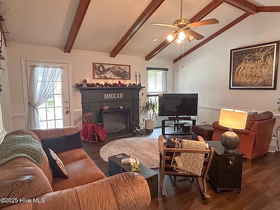 Step inside to find a spacious living room with vaulted ceilings, exposed beams, and a cozy fireplace, creating the perfect gathering space. The bright kitchen stands out with new granite countertops, ample storage, and stainless-steel appliances. It flows seamlessly into the eat-in kitchen area, which has large windows that bring abundant natural light. Off the kitchen is a formal dining space, library, and sitting area—you make it yours!