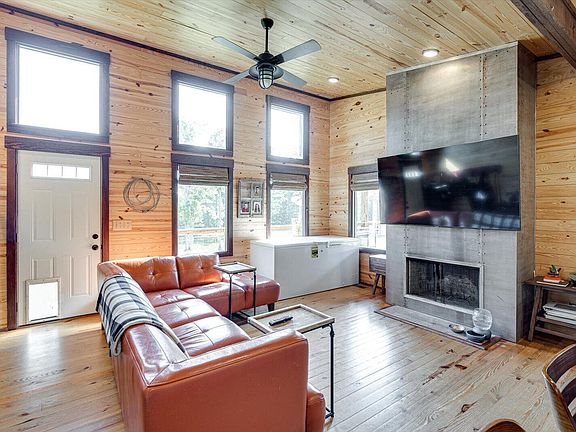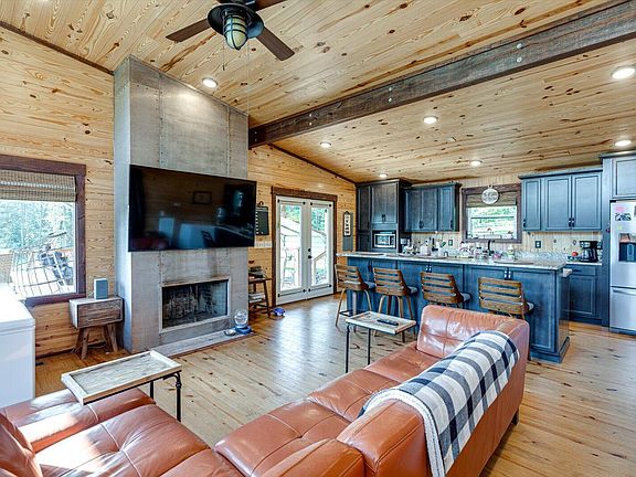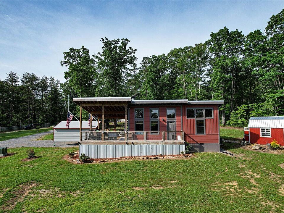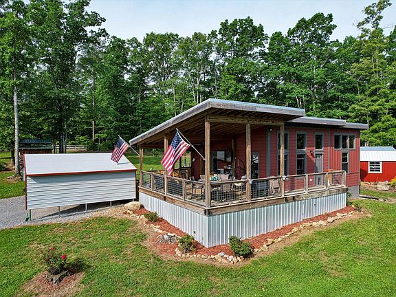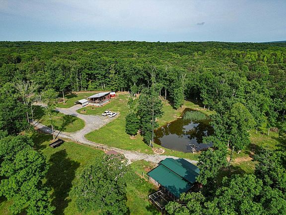 Beautiful Acreage with a 4 year old Modern Rustic Mountain Home, Tiny Home, Pond, Pole Barn, Storage Building and Chicken Coop. This level and gently sloping 9.84 acres has everything you need to accommodate live stock, grow a garden, have your own eggs and sell eggs. The sellers have added lots of natural stone around the pond where you can enjoy fishing from the bank or use a small paddle boat that will convey with the property. The seller has recently cut down many trees that were leaning or dead. The main home features an open floor plan with lots of natural light , hardwood floors, vaulted tongue and groove ceilings, barn doors, fireplace and metal roof. The kitchen has lots of custom cabinetry, granite countertops, island with storage all the way around, stainless appliances and copper finish farm style sink. The master bedroom has double closets and bathroom has a large tiled walk in shower.
