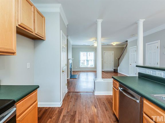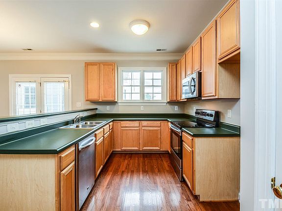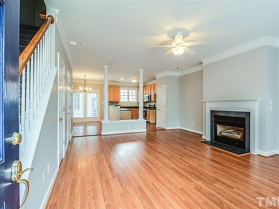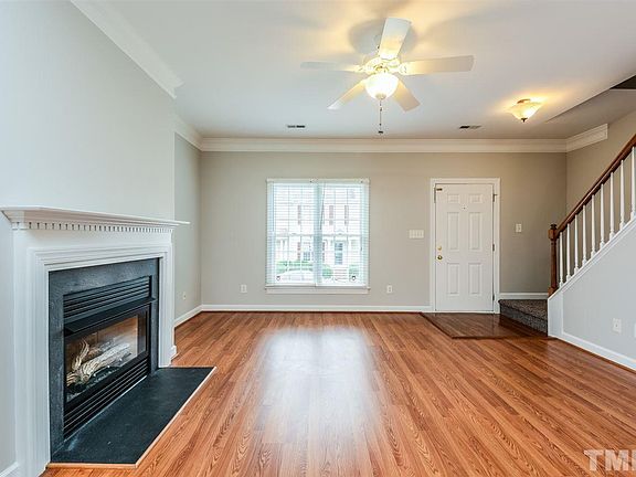 This Cary two-story offers hardwood flooring, a fireplace, and a one-car garage. Upgraded features include overall interior paint and newly installed carpet. Community pool and common area maintenance are part of the HOA.