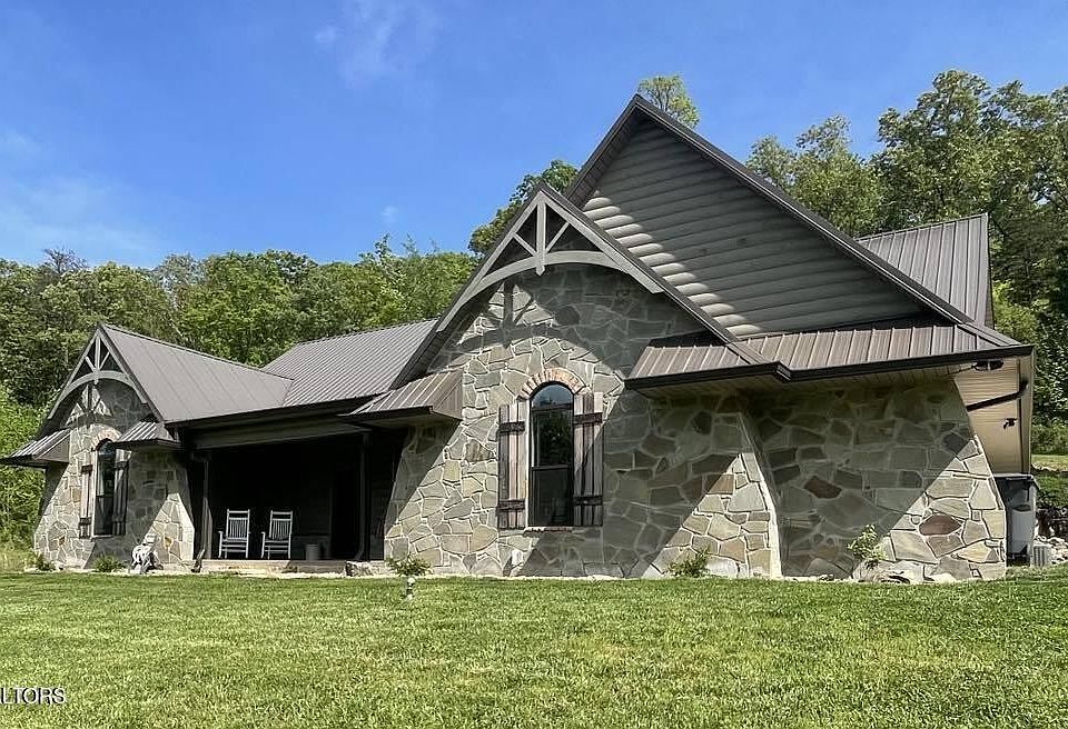 ''Nestled atop a picturesque mountain in Anderson County, TN, this stunning 2177-square-foot home, constructed in 2017, offers unparalleled views of the surrounding landscape and mountains. Situated on 5.6 acres of lush terrain, the gated entry leads to a sanctuary of luxury and privacy. The stone and 1/2 log siding exterior, complemented by a metal roof and covered front porch, exudes rustic charm. Inside, the open-concept layout boasts 3 bedrooms and 3 bathrooms, including a spacious master ensuite with a custom walk-in tile shower and double copper sinks. The kitchen features stainless steel appliances, a gas stove with a self-cleaning oven, stylish tile backsplash, and granite countertops, while the natural gas fireplace adds warmth to the family room. Stained concrete floors flow seamlessly throughout, enhancing the home's modern aesthetic, along with 9 ft ceilings adding to the spacious feel. With a private covered back porch, 2-car garage, concrete driveway, and close proximity to Oak Ridge and Knoxville, this move-in-ready retreat offers the perfect blend of luxury and convenience for discerning buyers seeking mountain living at its finest.''