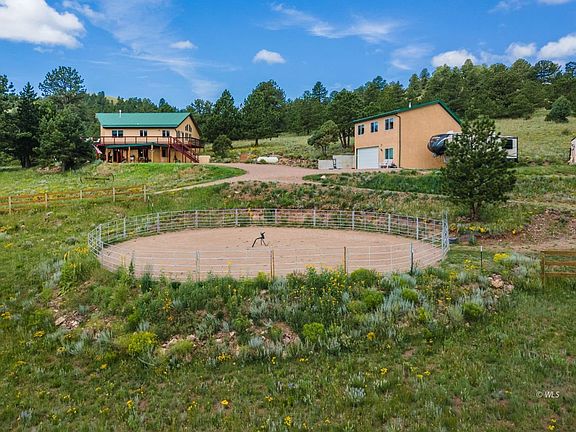 Enjoy the splendor of mature evergreens, gorgeous pastures, and private surroundings of this peaceful horse property, set on 10.12 gently sloping acres, which also backs to BLM land. The expansive great room features a vaulted ceiling and floor-to-ceiling windows perfect for enjoying the splendid mountain views and abundant wildlife. The spacious galley kitchen includes a welcoming dining room at one end and a cozy breakfast nook. The generous master suite, office/bdrm, and an additional bathroom round out the main living area. Downstairs, in the fully finished, walkout basement, you'll find a large family room, two bedrooms, and 1.5 baths, along with a full-sized laundry/utility room. Outside you'll love the garden areas, wraparound deck, carport, and a detached, oversized, two-car garage, which extends to a separate workshop. Over the garage features quaint guest quarters and ample storage. The stable, corral, and riding arena add the perfect finishing touches to this property. And, you're only 20-30 minutes to an abundance of amenities, including the Sangre de Cristo Mountains, Royal Gorge, lakes, trails, hiking, biking, and the town of Westcliffe.