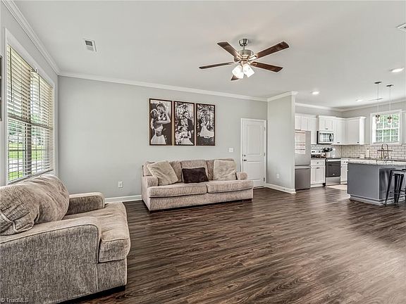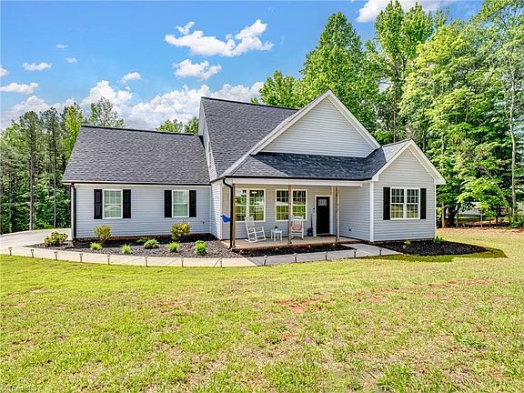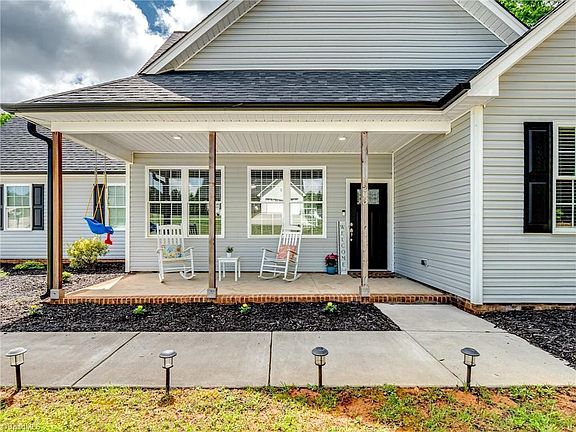 This charming 1.5 story home sits on over half an acre! You will love the open floor plan with the primary bedroom on the main! Large primary bathroom features dual basin sinks, his & her closets, shower AND a soaking tub! Laundry room on main level. Kitchen is equipped with stainless steel appliances, island w/bar seating, pantry & a dining area! Two additional bedrooms on the upper level. No HOA & close to Downtown Mocksville shops & restaurants and a quick drive to I-40!