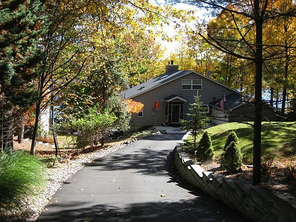 Home on large lake. Spectacular views from almost every room in this 3 level Contemporary Lakefront Home, with low to no maintenance. Features Vaulted ceilings, open floor plan, loft, wood fireplace in living room, family room with free standing propane fireplace, master bedroom with master bath on main floor, 2 over sized decks (1 with a screened in area) 2 car garage, paved driveway, dock and shed.