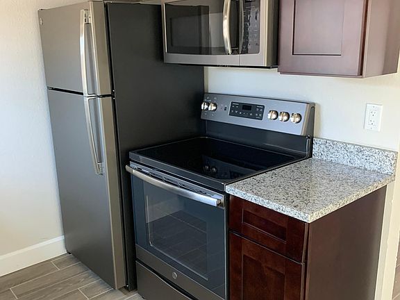 Features porcelain tile wood grain floors, wood grain vinyl flooring upstairs. GE slate appliances, solid wood shaker cabinets with granite countertops. Moen faucets, Levolor wood faux blinds, fans in bedrooms. LED lighting. Washer and dryer, garbage disposal, dishwasher all included. Covered carport. Privacy vinyl fence! AVAILABLE FIRST WEEK OF MAY!
