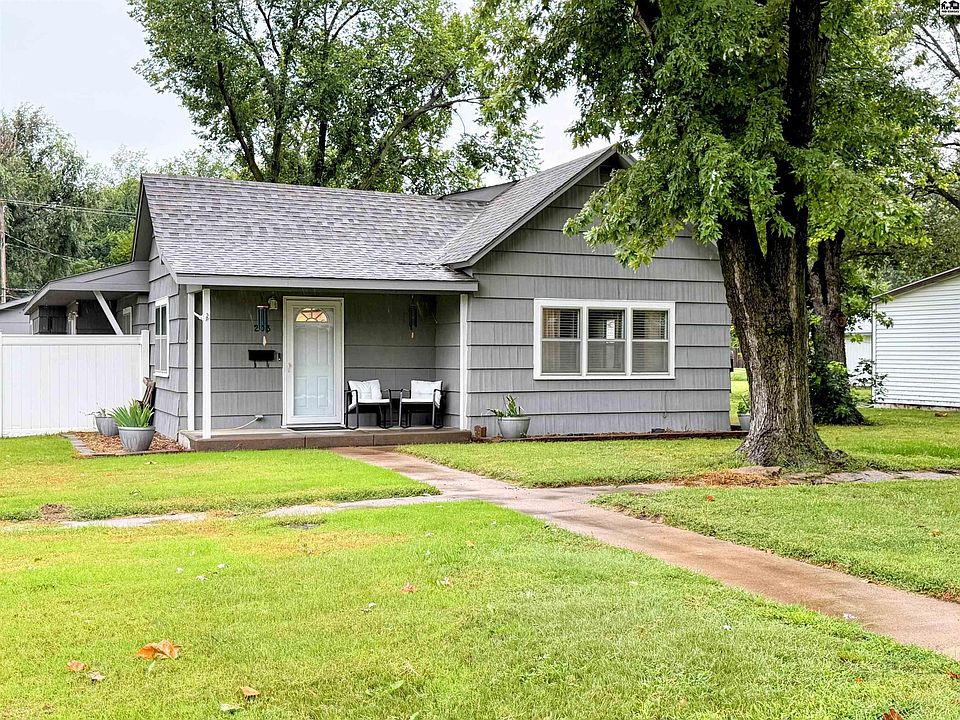 Welcome to 203 N. 3rd St. in the charming town of Sterling, Kansas! This beautiful and well-cared for home boasts 4 LARGE BEDROOMS, 2 full bathrooms, a large laundry/mud room and an OPEN living/dining/kitchen area with a BREAKFAST BAR and ISLAND! You'll be amazed as soon as you walk in the door with the size and open feel of the living room, dining area and kitchen. These rooms feature nice, vinyl flooring, updated lighting, stainless steel appliance and QUARTZ COUNTERTOPS! The laundry/mud room is in the center of the home making it easy and convenient to keep up on laundry and corral dogs coming in from the HUGE, FULLY FENCED backyard! The home sits on a VERY LARGE, CORNER LOT and has ALLEY ACCESS making it very easy to pull into your 2 CAR DETACHED GARAGE!