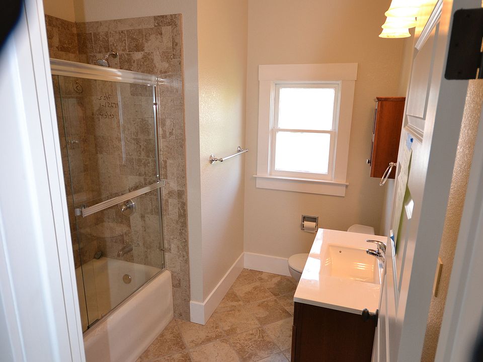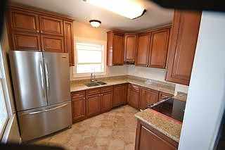 All New! Just finished a complete remodel of this upstairs flat. Three bedrooms and 1 1/2 baths. Kitchen has beautiful all wood cabinets, refrigerator, microwave, Bosch dishwasher, washer/dryer unit. Tile in kitchen and carpet in bedrooms.