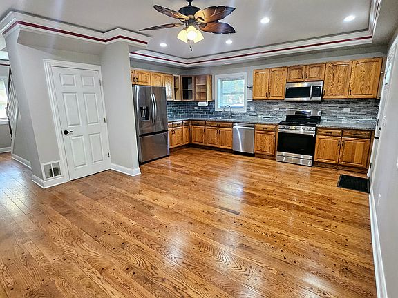 Newly remodeled. Freshly painted, new carpet in all 3 bedrooms, new stainless appliances. Garbage disposal. Newly refinished hardwood floors in living room and kitchen. Open floor concept. Vaulted ceiling in living room. New lighting fixtures/ceiling fans that have remote controls. Whole home water softener. Led strip lighting built-in to crown molding with remote. Driveway will be newly sealcoated 6/11 House on large Double corner lot. Move in cost: Rent x3 Utilities paid by tenant. No smoking.