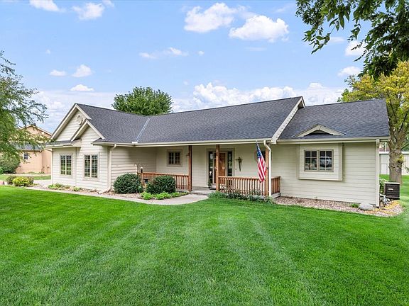 Beautiful edge of town ranch home with an inviting front porch! Quality throughout with wood floors, concrete siding, custom cabinets, 6 panel doors & a poured foundation! Master suite includes a whirlpool tub and a large walk in closet. All kitchen appliances, window coverings and washer/dryer will stay. 2021 new water heater. 2023 new roof and gutters. 2024 new water softener. Home includes several custom features including a sprinkler system, a covered deck & a gas fireplace. Finished walkout lower level has a rec room, bathroom, bedroom, 4th nonconforming bedroom / office and spacious storage room.