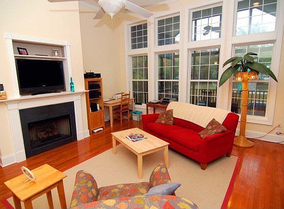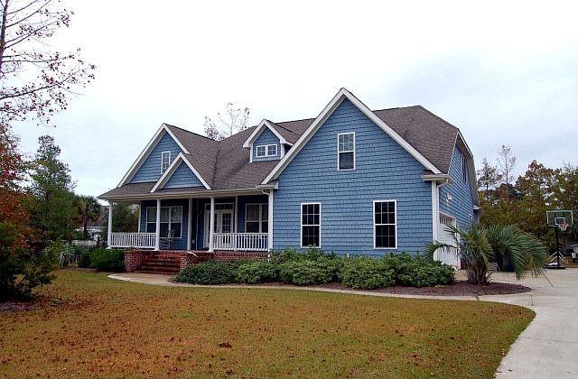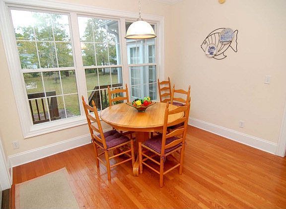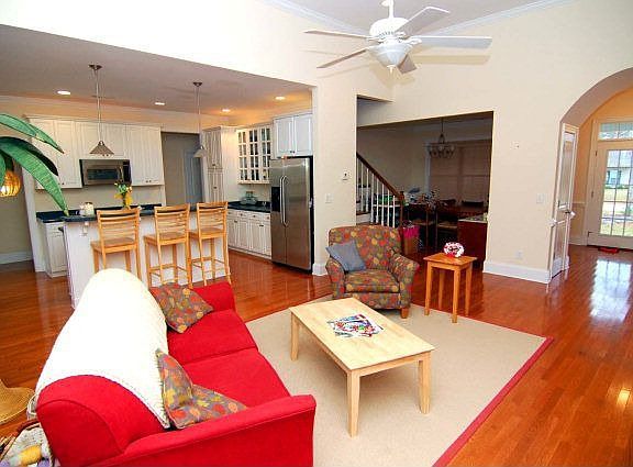 Tons of light enters this open concept living room/kitchen/breakfast area complete with hardwood floors and vaulted ceilings. Formal dining room off the kitchen. First floor master bedroom offers dual sinks, separate shower, walk-in closet and french doors to the deck. The second and third bedrooms are on the opposite side of the home and also on the first floor. A large fourth bedroom with a full bath and bonus room are upstairs. Wonderful screened porch, deck and patio on the back. Large yard with storage area that is wired for electricity!