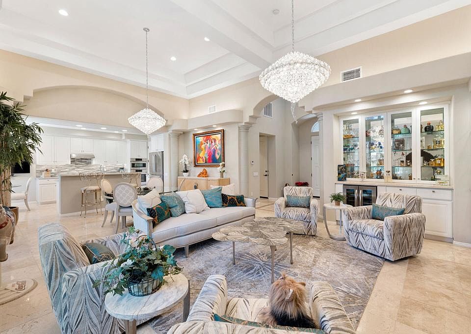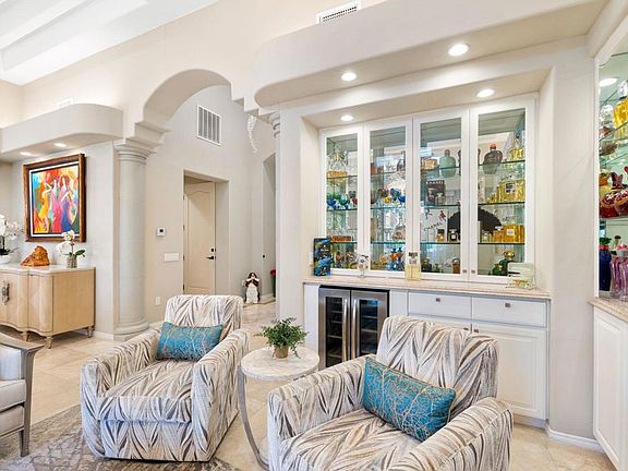 Welcome to this impeccably remodeled Florence model home in the desirable ''Casita'' section of Villa Portofino. Enter through a stunning rotunda foyer into an open living area with high ceilings, up lighting, and Travertine floors. The living room features a 74'' electric fireplace, built-in cabinets, wine/soda refrigerator, and granite countertops. The new(er) kitchen boasts a 30'' Bosch 5-burner gas cooktop, Bosch microwave/convection ovens, a Bosch 36'' refrigerator, Bosch dishwasher, quartz countertops, and a glass tile backsplash. Lower cabinets with pull-out shelves add convenience. The adjacent breakfast nook, with three large windows, overlooks a landscaped pathway. The den/office off the entry has custom shelving, cabinetry, a 50'' electric fireplace, and French doors to the front patio. The second bedroom comes fully equipped with custom built in murphy bed perfect for guest. The primary suite offers a size to fit a King-sized Caracole bed, dresser, side tables, and features custom drapery & double doors to the back patio. The new(er) remodeled master bath includes an extra-large shower, porcelain tile floors, a Kohler double sink vanity with quartz countertops, and Hansgrohe fixtures. Villa Portofino residents enjoy a clubhouse, on-site movie theater, gym, yoga classes, pool, aquatic classes, and The Bistro. Centrally located in Palm Desert & just a short drive to El Paseo, this 55+ community offers luxury and convenience. Welcome home!