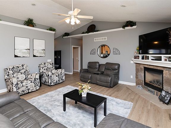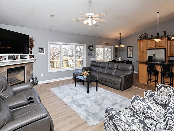 This ranch home is located on a corner lot, with a fenced in backyard. The line of trees and creek running on the backside of the property offers lots of privacy. With 4 bedrooms and three baths, including a finished lower level with a walkout, this home has ample space for relaxation and entertaining. Stepping through the front door, you're welcomed where nine-foot ceilings and vaulted ceiling in living room, create an open layout and seamless flow between the living room, dining area, and kitchen, making it ideal for gatherings with family and friends. The living room is a cozy retreat, anchored by a gas fireplace. Sliding glass doors lead out to a spacious newly redone deck. The kitchen has nice cabinet space for storage and a pantry. The main level also includes laundry room, primary suite and attached bath. Two additional bedrooms and a full bathroom complete the main level. In the lower level, you'll find a large family room, 4th bedroom, bath, all that provides extra living space. The fenced yard and patio assure additional space for outdoor entertaining. This home has a new furnace, new central air, new paint, new flooring, central vac, irrigation system, sump pump and Home Warranty. Home is conveniently located near Norwalk Schools, Norwalk McAninch Sports Complex, Fareway Fields, shopping, restaurants, churches, city parks, and swimming pool! Also, located near G14 Hwy for easy access to I-35. Make an appointment today to see this home!
