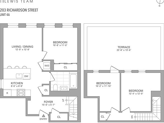New Construction 3-Bedroom with Private Roof Terrace and Balcony in Williamsburg Offered for rent a new construction fourth/fifth floor duplex apartment in a modern 7-family building on Richardson Street, just off Humboldt Street. The apartment is arranged with an open living/kitchen area facing south, a large bedroom on the main floor, and two additional bedrooms on the upper floor. One of the upper bedrooms opens out onto an expansive roof terrace with Manhattan skyline views. 203 Richardson Street was built in 2023. Key features of this apartment include: A thoughtful and modern layout that maximizes usable space, including an small entry foyer with two coat closets. A private roof terrace. A modern kitchen with a breakfast peninsula, Caesarstone counters, a full suite of stainless steel appliances, and bountiful cabinet space. Central (Split) or through-wall air conditioning units in each room for tenant-controlled climate year-round. An in-home washer & dryer (stackable) A tasteful and spacious bathroom with soaking tub and vanity storage. Modern double-glazed windows designed to maximize light and create a modern feel. Recessed lighting throughout. Video intercom. 203 Richardson Street is located nearby to the Graham Avenue station for L-train service. McCarren and McGolrick Parks are also a short distance away, as is neighboring Greenpoint. Below are a summary of the fees associated with renting this apartment: $20 Credit Check Fee (per applicant and guarantor) $6,195 First Month's Rent $6,195 Security Deposit $50/Month Pet Fee, Per Apartment (If Applicable)