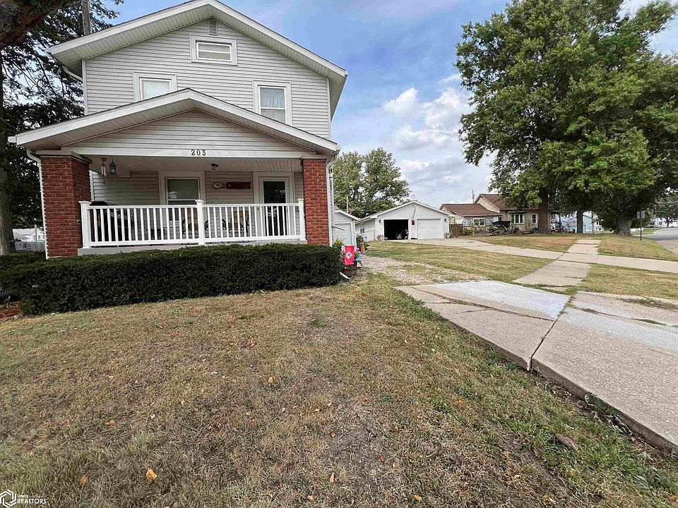 You feel Welcome at the Front Porch!! This traditional two-story Home with 3 Bedroom /2 Bathroom home has several updates including new roof in 2023, new dropped ceiling in kitchen, remodeled Bathroom including plumbing and wiring, a new fenced in back yard, and composite decking on front porch. The detached 2 car Garage includes a new electric heater and 100 amp service. **Seller's will include new Kitchen sink, Dishwasher and additional flooring for new Owners to install. Basement has been partially finished with 3/4 Bath, Office and Family area.