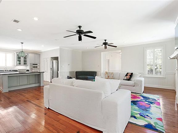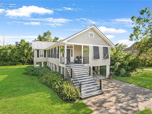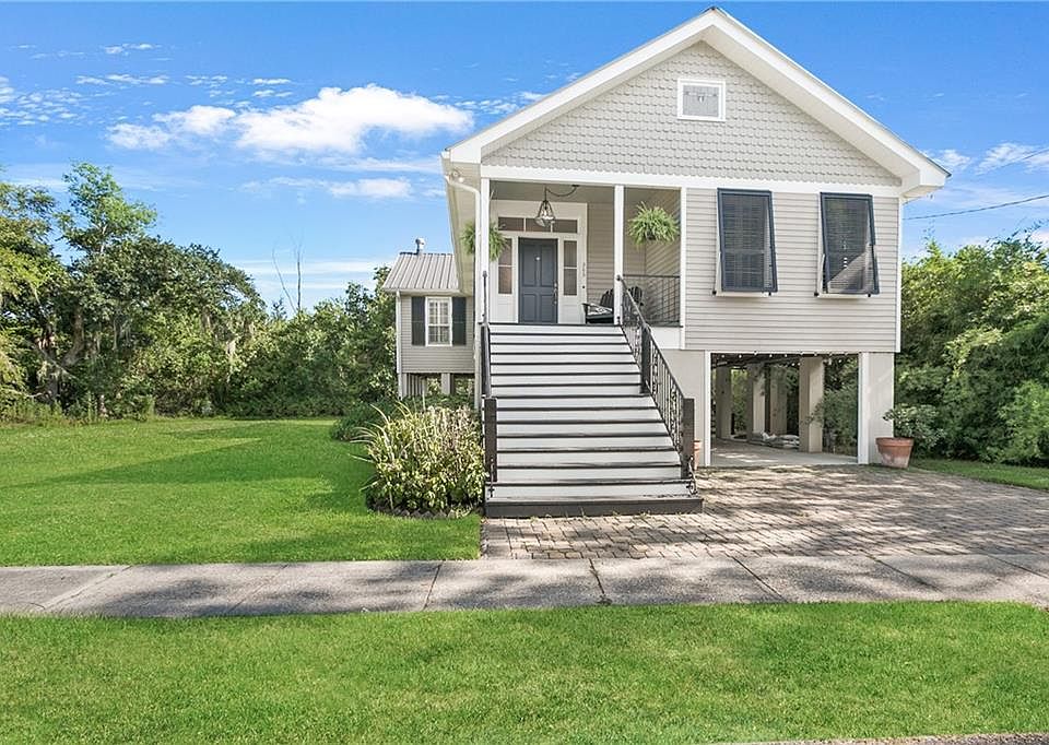 Rare find in quaint Historic Madisonville within walking distance of the Tchefuncte River, shops, restaurants and year round festivals. House is surrounded with beautiful lush landscaping including native plants, bushes & trees. The custom stair rails lead to an inviting front porch. The front door with cut glass side lights opens to a long hall with bedrooms to the right. This front portion of the home is approximately 85 years old while the rear portion was added 30 years ago. Plantation shutters, 5" pine flooring, beaded board wainscoting & 9' ceilings throughout. Bright living room includes a gas fireplace, built-in bookcases/display shelves, window seats/storage & two ceiling fans. Large formal dining room. Outstanding efficient kitchen has a center island, six burner gas stove, stainless vent, cabinets with glass doors, wine rack, stone counters and a large pantry. Living, dining & kitchen open for entertaining. Primary bedroom suite features a relaxing bath with a jetted tub, separate shower, decorative mirrors, large closet & tiled flooring. Second bedroom has two built in areas with shelving and drawers. The attached bath has quartz counters & a large ornate shower. A huge guest bath includes a free-standing tub with original artwork on the above wall as well as a traditional pedestal sink. Exterior of home has attractive Bahama-style shutters. Peaceful & private back yard overlooks a wooded area. Ground floor includes entertainment area/patio with covered parking. Elevator for convenience at rear steps. Home was raised after Katrina. Don't miss this exceptional home & desired location in the friendly city limits of Madisonville.