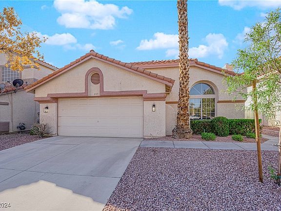 Located in the heart of Green Valley, 203 Shadow Pointe is a remodeled single story home with vaulted ceilings and wide backyard. You are greeted to new blonde luxury vinyl floors and an open floor plan. Past the living room, the spacious kitchen has new quartz countertops, recessed LED lighting and stainless steel appliances throughout. Room for bar seating and a breakfast/dining table area - with views of the green backyard! Family room is across the kitchen, also with backyard views, and includes a new electronic fireplace and TV! Outside, a built in patio provides shade while enjoying the wide lot. The master bedroom also has a large slider with assess to the backyard. Walk in closet. New carpet in all of the bedrooms. Solar for low energy bills! Located less than 10 minutes from The District, Henderson Silver Knights Arena & more. One of the best communities and school zones in Vegas.