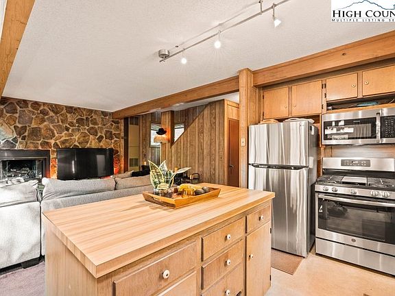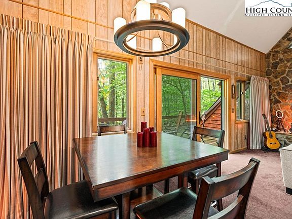 Discover this unique and spacious two-bedroom, two-and-a-half-bath Canadian Red Cedar home nestled on Beech Mountain. Located just off Charter Hills, this architectural gem offers seasonal slope and mountain views. The main level features vaulted ceilings and an open-concept kitchen, dining, and den area with a stunning large stone fireplace, creating a warm and inviting atmosphere. Step onto the back deck and enjoy the tree house ambiance surrounded by nature. Upstairs, you'll find a large primary bedroom with vaulted ceilings and a modern en-suite bath featuring a walk-in tile shower and double vanity. Storage is plentiful throughout the home with ample closets. The lower level offers another spacious bedroom and full bath, currently set up as a media/production room, with a separate entrance leading out to the backyard. Additional amenities include newer laundry appliances, ample parking, and a large storage shed at the back of the property. With a bit of imagination, one can see the possibilities of the lower level becoming a guest suite. Come and check it out and make this sweet spot yours! Trailhead to Pond Creek hiking trail is just around the corner, as well as the Beech Mountain Resort. Please note: furnished with exceptions. Professional measurements differ from tax records. The tax card's square footage reflects only the main living area and decks, excluding the finished basement and upper level. The seller purchased the home in its current condition — no permits found on file.