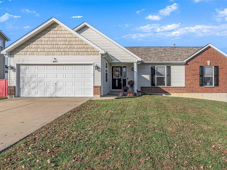 YOU MUST SEE this Custom & Former Display Ranch home that has been well maintained w many recent upgrades including newer seamless wood plank flooring. The foyer welcomes you into this spacious open floorplan w vaulted ceilings & cozy gas fireplace w marble surround, custom wood trim & mantle in the Great Room. Enjoy cooking & entertaining at the butterfly peninsula bar that opens to the Great room, plus extra space & light from the Bay Window along w newer atrium doors. Step outside & enjoy the level fenced, backyard w large patio. French doors open into the primary bedroom w vaulted ceiling & updated luxury ensuite bath w jetted garden tub, separate shower & large walk-in closet. 2 more bedrooms & updated hall bath, this home is Move-In Ready. The Seller will provide 1 yr Choice Ult Home Warranty for the Buyer's peace of mind. This home has the convenience of main floor laundry & the full basement w rough in is ready for your finishing touches. Water softener '22, HWH '21, Roof '20.