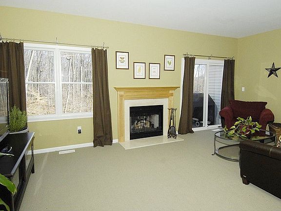 Fabulous townhome with high ceilings and an open floor plan impeccably maintained. Two-story entry foyer with hardwood floors, large eat-in-kitchen overlooking dining room and living room with gas fireplace. Deck off living room offers fabulous wooded views. Two huge bedrooms with large walk-in closets, master with Jacuzzi tub/shower. Huge lower level with high ceilings just waiting to be personally finished. Walk-out to level grassed yard, and built in garage on first level. Neutral decor! Move right in. Nothing to do! Low maintence fees - $105/month