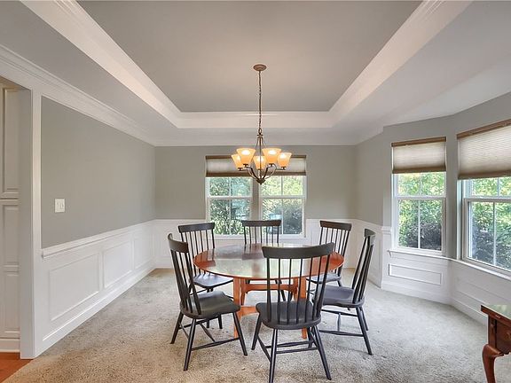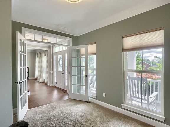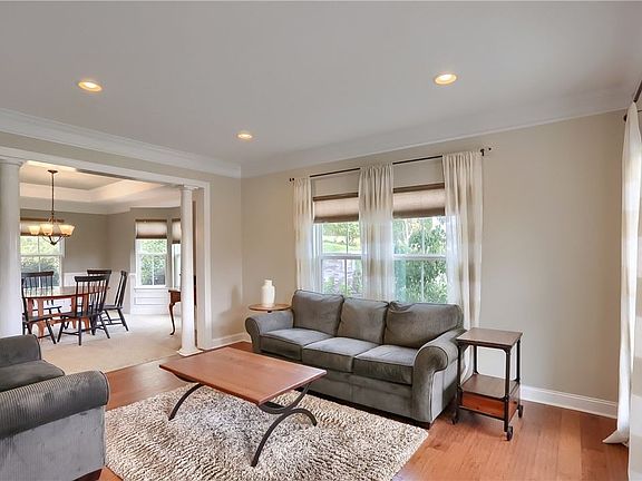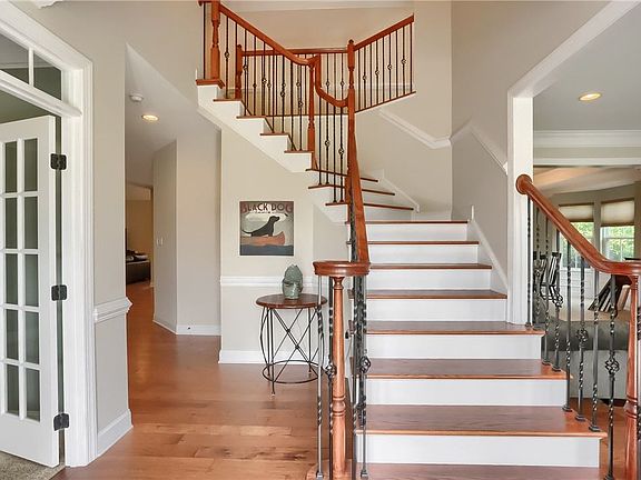 Striking home with sought-after floorplan, ready for new owners. Grand foyer with wrought iron staircase, gleaming hard wood and trim. French doors lead to private den. Elegant living room is perfect for conversation and opens to the dining room with bay window, trey ceiling and access to the gourmet kitchen. Any chef will be delighted with granite, abundant cabinetry, stainless, custom backsplash, island with seating, modern pendants and open to the morning room with vaulted ceiling, rear views, and access to the courtyard style patio with fire pit. Stacked stone fireplace, bright windows, vaulted ceiling, and back staircase demand your attention in the family room. Double doors lead to primary bedroom with sitting room, spa like bathroom with granite, soaker tub and tile shower. Guest features include junior suite and bedrooms with Jack and Jill. Versatile lower level has a full bath and storage. This home offers something for everyone, indoors and outdoors with nearby park access.