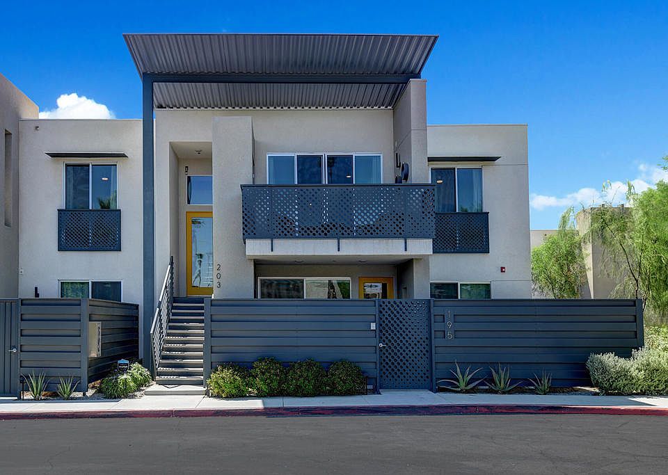 This impeccably-maintained, upper-floor, two bed, two bath condo in the modern enclave of 64@TheRiv sits within walking distance of the chic Uptown Design District, and within a few minutes drive of downtown Palm Springs. Recently built, this bright, luxurious condo has a tankless water heater, private patio with great views, high ceilings, modern appliances, and custom cabinetry. Walk-in closets, a large pantry, and utility closet provide plenty of storage space for you or your guests (HOA allows for 30-day minimum rentals). Well-manicured grounds flank a sparkling 60-foot community pool, hot tub, dog park, electric car chargers, and sitting areas with views of the surrounding mountains. Low HOA and you OWN THE LAND! Some furniture is available outside of escrow. Don't miss out on this wonderful opportunity!