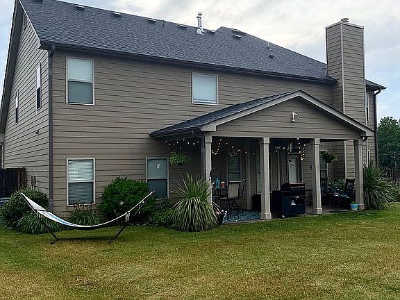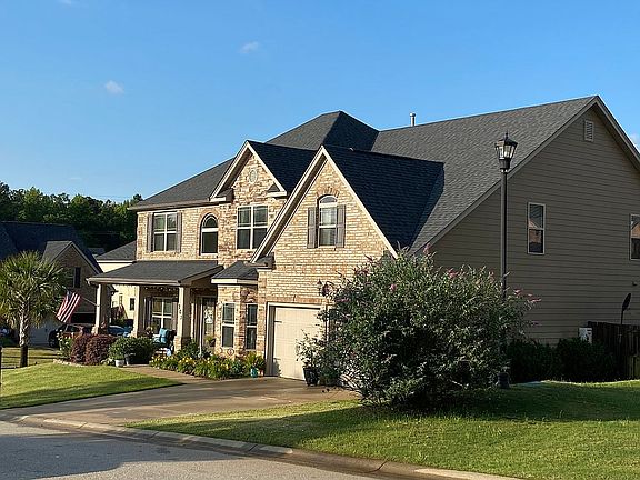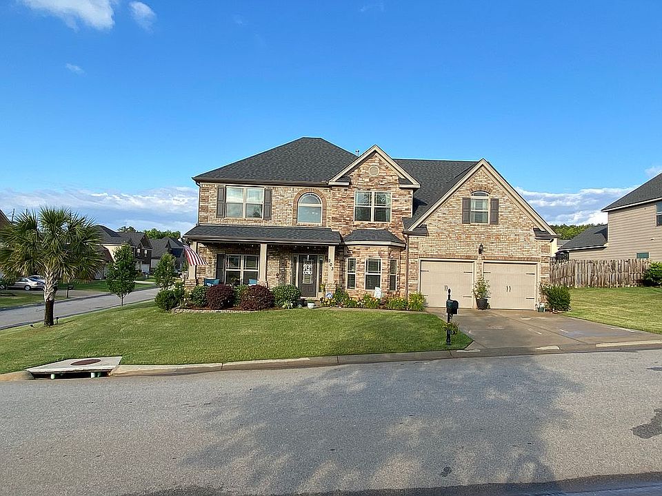 Spacious 5BR/3BA loaded with architectural upgrades. High ceilings, heavy crown molding, engineered hardwoods throughout majority of main level. Gourmet kitchen with granite countertops and blacksplash, stainless steel appliances, and gas cook top. Open floor plan with bedroom and full bathroom on main. Great room features gas stack-stoned fireplace and gleeming hardwoods. Covered porch with fans leads to private park-like backyard with full privacy fence. Expansive Owner Suite with sitting area, 2 seperate his-her walk-in closets, double vanity, garden tub and tiled walk-in shower. All upstairs bedrooms with high ceilings. Neighborhood amenities include zero entry community pool, clubhouse for private parties and events. Boat storage area also available. Beautiful pool and playground area within walking distance. Upgrades and details rarely seen outside of custom homes. Bedroom on main floor has shared full bathroom.