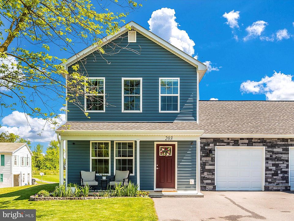 Let the breezy front porch and beautiful landscaping welcome you home to this well-maintained colonial-style duplex! LVP flooring flows throughout the spacious living room and main level. The kitchen offers granite counter-tops, a butcher-block top island w/seating, upgraded soft close cabinetry, and stainless appliances. The main level half bath also provides space for the washer and dryer which convey with the sale. The 1-car garage is finished too! The upper level provides a primary suite with bathroom, 2 additional bedrooms, and a 2nd full bath. The backyard offers a patio for grilling and raised garden beds with some vegetables and herbs already in place and room for more! This home was built in 2021 and boasts upgraded siding and 30-year architectural shingles. No HOA! Easy commute to I-81, Shepherdstown, and all amenities. It's a great home and won't last!