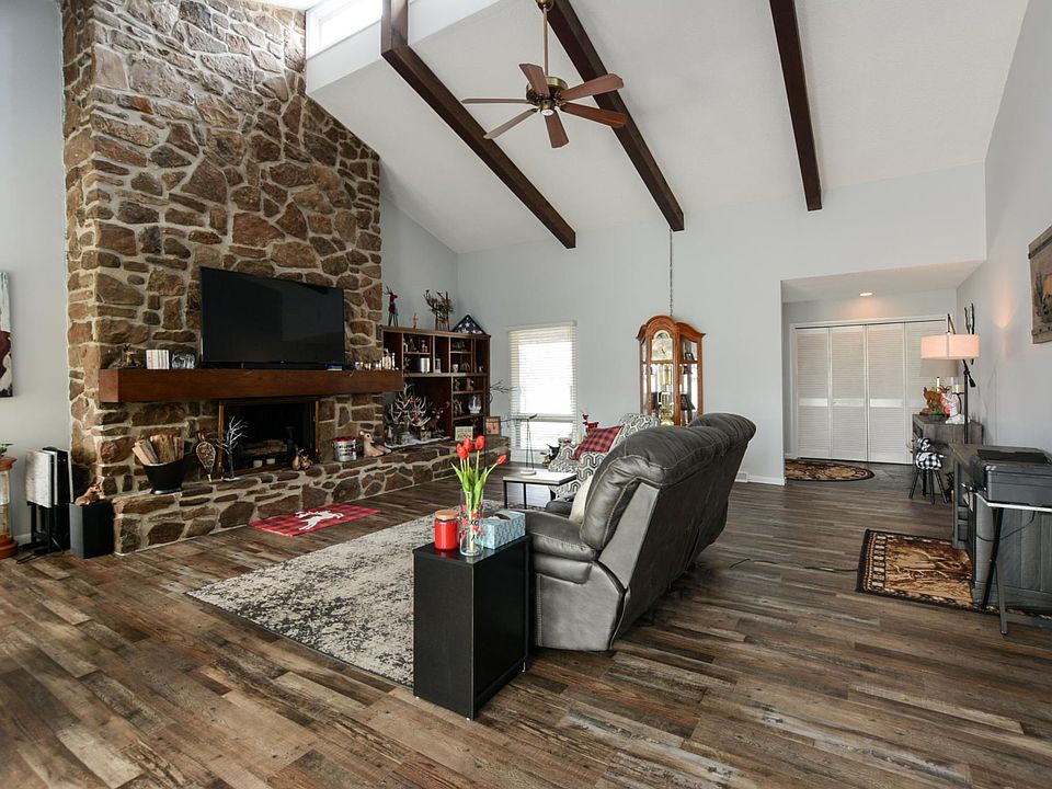 The following features make for a spacious and lovely home: Very high cathedral ceiling in large living room with beautiful fireplace. Luxury Vinyl Flooring and nearly new carpet. Large laundry room. Cute fenced back patio area Mowing provided by landlord Large bedrooms An eating area by the kitchen and an additional space for a reading nook or formal dining area. Nice stainless refrigerator Dishwasher & Double Oven One car garage Renter Pays Utilities No smoking No Pets Landlord provides mowing