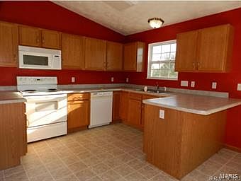 Wonderful split bedroom ranch on a corner lot in new Valmeyer is waiting for you to make your mark on it. Personalize with your paint colors and freshen up the carpets and the house will feel like new. The kitchen, dining area and living room have vaulted ceilings and a wide open feel. Sliding glass doors lead to a fenced back yard. You will love the convenience of the main floor laundry and the attached garage. A full, unfinished basement features an egress window, enabling you to finish off additional bedroom space if you wish. Bank of America associates, household members or business partners prohibited from purchasing.