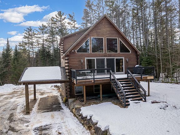 This mountain retreat is located just as you enter the town of Bethel and seven miles from Sunday River Ski Resort. Tucked back on a three acre lot surrounded by pine trees this chalet style home offers a paved driveway with carport for easy access into the home. The cathedral ceiling and gas fireplace provide family and friends an ideal place to gather. The home has three levels of living space which includes four bedrooms with three full baths. The oversized mudroom and walk-in closet keep all the gear organized and accessible. The ground floor access offers an ensuite bedroom and bath highlighted by 20 foot ceilings and a large family room. The main floor has an open concept living space with kitchen, dining and great room. From the living space you access the newly built deck from large sliding glass doors with an abundance of natural light and cathedral ceiling this great room has it all. Rounding out the main floor is a bedroom and full bath with washer/dryer. On the second floor there are two more bedrooms and full bath. This property is ready right now, it's sold fully furnished along with a snow removal contract in place. A truly turnkey property.