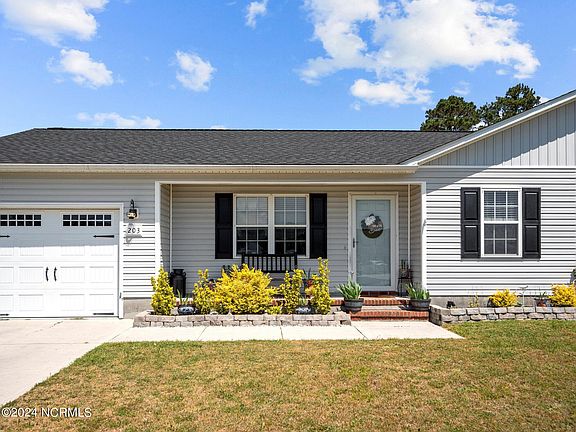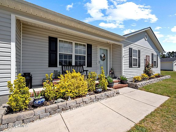 Welcome home to 203 Wingspread Lane in the quaint little community of Eagle Chase! This home has been beautifully maintained, and is ready for its new owners. Step up to the covered front porch, appreciate the established garden beds, and fall in love before you even walk inside. The front entryway leads directly into the spacious family room. Directly off the family room is the combo kitchen/dining room, and down the hall you will find a spacious primary bedroom with a lovely en suite bathroom. Additionally, down the hallway, you will find two additional bedrooms, all of which have been freshly painted, and a secondary full bathroom. Off the kitchen you will find a large laundry room, which leads you to the attached garage. Step out back and appreciate the huge, fully fenced in backyard- perfect for entertaining! There is a large porch, a storage shed, and plenty of space to run around, play games, grill, or just hang out. There is a double gate so you can easily access the yard, but also plenty of space to park your RV or boat on the side of the house outside of the fenced area, and there is an RV outlet installed as well. Roof was recently replaced only 2.5 years ago! You don't want to miss this opportunity, schedule your showing today!