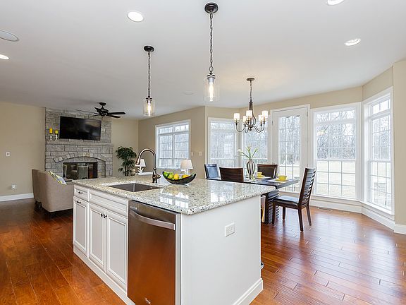 This 4 bedroom, 3.5 bath, 1.5 story home has 3,903 sq feet of fantastic living space and a MAIN FLOOR MASTER SUITE. The elevation is elegant with brick, stone, upgraded front door, architectural shingles, professional landscape, irrigation system., custom paver patio, seating wall, fire pit and backs to trees. Features include 9’ main floor ceilings with a 2 story Great Room, see through fireplace between Hearth and Great Room, bay windows, 42 inch Maple cabinets, island with breakfast bar, granite countertops, stainless steel appliances, Deluxe Kitchen with exceptional finishes, stone backsplash, dry bar, drop zone, wood floors, crown molding, custom trim, wrought iron spindles, walk in closets in every bedroom, security system, custom closets, zoned HVAC, humidifier, R 50 attic insulation and so much more. Wyndgate Oaks is an amenity-packed neighborhood with over 50 acres of wooded common ground, a pool, bathhouse, parks, a sports court, a 3 acre lake and trails for walking and biking. This fantastic location is close to the many shops, restaurants and recreation near Hwy N, 40 and 364 and is a short commute to Chesterfield Valley. Spectacular, must see home showing agent also the display fully loaded showing agent only