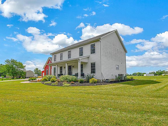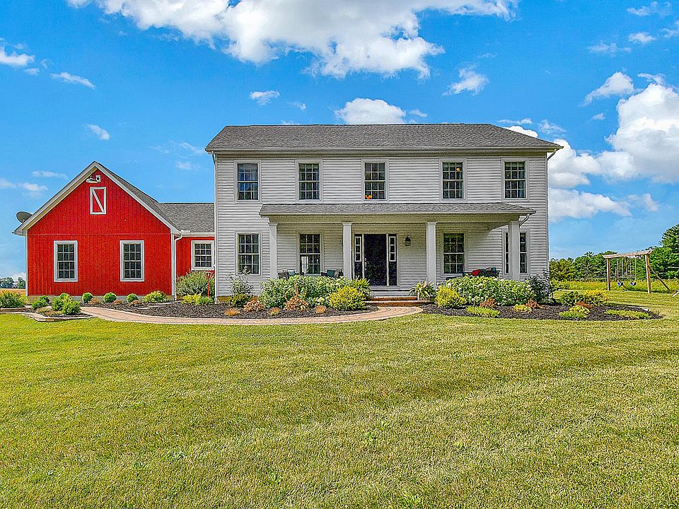 WHY WAIT TO BUILD!! Move in ready two story home situated on 2 acres that is secluded from the main road and backs up to farm land. Enjoy an owners suite on the main floor with separate shower and soaking tub. Three spacious bedrooms plus a loft upstairs. Very open concept from kitchen, dining room and vaulted ceiling great room. Kitchen offers darker cabinets, island and granite counter tops. Off the garage is a mudroom and the laundry room with shelving. New partial finished basement with wood columns and bar area that is great for gatherings. Step outside to a professional paver patio with built in fire pit and pergola. 30' x 45' barn with garage door and a side door. Ample space to have enjoy your hobby! Don't let this one pass by!