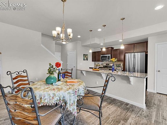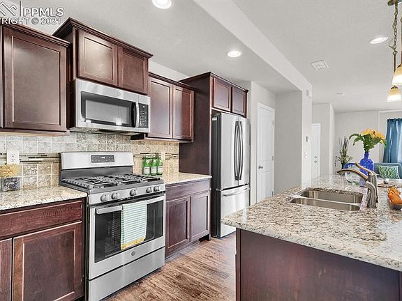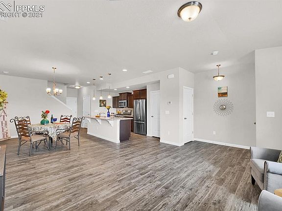Brand NEW home, still under the Builder's Warranty! Spacious open floor plan with gorgeous luxury vinyl plank flooring. Enjoy more privacy as this location backs to open space and views of the Colorado mountains! Kitchen boasts oversized island, stainless steel appliances including gas stove, granite counters, spacious pantry and pendant lighting. Main level is ADA compliant with zero entry from the garage, and extra large main level bathroom. The master retreat includes an additional nook, USB outlets, attached oversized bathroom with spa shower, and huge 9' x 6' walk in closet! Two additional bedrooms also include spacious walk in closets. Conveniently located laundry is upstairs and the washer and dryer are included! Homeowners will love the included amenities in this great community - outdoor pool, dog park, playground, gym, dog/car wash, and more! Conveniently located near downtown, military bases, 1-25, shopping and more! Don't walk, run! This one will go fast...!