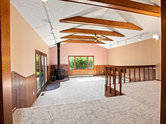 This house has been completely updated with new paint and carpet and has 3 main floor bedrooms and 2 in the basement with egress windows. The master bedroom has 2 closets and an en-suite bathroom with dual sinks. The kitchen has a gas range, dishwasher, nice cherry cabinets with soft close hinges and a breakfast bar. The main level boasts a large family room addition with vaulted ceilings and a wood burning fireplace, and another wood burning fireplace in the other main floor living room. The basement also has another living room and a remodeled bathroom. The laundry room is right off the garage entrance and there is a huge pantry. The lot is just over half an acre and has a shed.