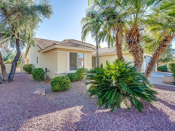 Prime location for this popular Oakmont model and former model home that is within walking distance to the restaurant, pro-shop, fitness center and pools. Enjoy the beautiful view from the front patio of the golf course and pond. This Southwest style home shows beautifully with it's warm light and airy ambience. The unique interior architectural finishes and thoughtful upgrades including wood flooring throughout, hand crafted wood shutters, tasteful wallpaper and sophisticated Minka-Aire ceiling fans. The spacious kitchen features sleek black Corian counters and maple cabinetry and drawers. The dining area in the kitchen has Banco Seating with generous storage in the seating area. The large laundry room has functional built-in cabinetry and newer Maytag washer and GE Dryer. The den/formal