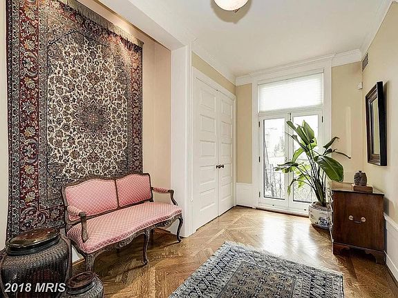 Stunning, light-filled and elegant apartment on quiet, tree-lined street at the heart of historic Dupont Circle. A grand entrance and formal dining room and living room with wet bar are perfect for entertaining visiting VIPs. Hardwood floors and custom crown molding throughout. Three Juliet balconies overlook a private garden in back. Large kitchen includes Viking 5-burner stove and Fisher-Paykel two drawer dishwasher with charming breakfast nook. Beautiful master bedroom with attached bathroom and dressing room. Gorgeous custom built shelves throughout including hidden door in bookcase leading to second bedroom. Building is historic landmark designed in 1897 by renowned architects Hornblower and Marshall, the same architectural firm who designed the Museum of Natural History, and the Duncan Phillips House, home of The Phillips Collection which is literally just steps away. There is absolutely no place like this in Washington, DC -- it is breathtakingly unique! Renter is responsible for electric, gas, internet and 50% of water bill. Renter's insurance is required.