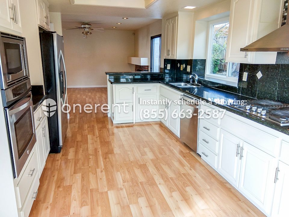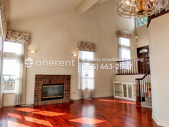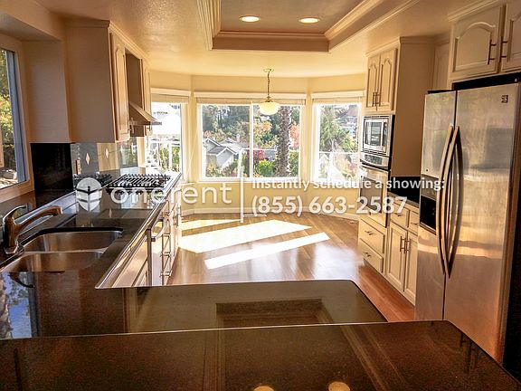 Amazing, 4 beds, 2.5-baths, 3-car garage single-family home in the Mission San Jose - Cameron Hills neighborhood in Fremont. Located in a quiet cul-de-sac with no through traffic. Walking distance to Warm Springs BART Station and close to freeways 680 and 880. Unobstructed beautiful views of Mission Peak, The Bay, San Jose Downtown Area and City Lights at Night. Views of hills/bay/city lights from every room of the house. With beautiful and freshly painted walls inside! Near top high ranking schools such as Mission Valley Elementary, Hopkins Junior High, Mission San Jose High School The lovely unfurnished interior features cherry hardwood floors throughout the living room and all the bedrooms, high ceilings and a brick fireplace in the living area, picture window to enjoy sunrise and views from the living room, and a huge master bedroom suite with a walk-in closet. A fully upgraded contemporary kitchen equipped with black granite counter tops, huge kitchen pantry for storage, stainless steel appliances such as a refrigerator, oven, stove top, microwave, and dishwasher. The bathrooms have a shower stall with a glass door in a metal frame, bathtubs, and vanity sinks below large mirrors. Other appliances include an in-unit washer with dryer and for climate control, centralized air conditioning and heating are installed. The exterior features a yard with an artificial turf that is easy to maintain and a stunning gazebo and deck in the backyard - perfect areas for outdoor dining or entertaining guests. There is also a shed available at the back for storage. Small Pets are welcome with a pet deposit of $500/pet. Smoking is prohibited. Tenant's responsibilities are water, gas, trash, electricity, cable, yard maintenance, and the internet. The landlord will handle the HOA fees. Nearby Parks: Arroyo Agua Caliente Park, Old Mission Park, and Mission San Jose Park.