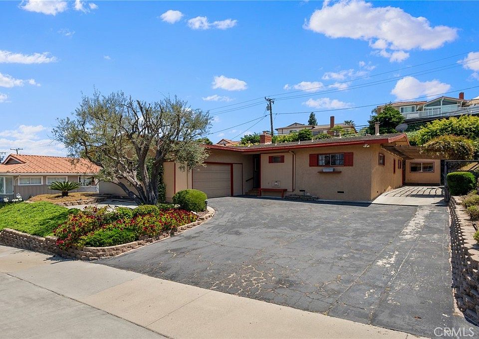 PRICE IMPROVEMENT! This home is in the sought after Rancho Palos Verdes community and prestigious award-winning Palos Verdes Peninsula Unified School District. Lots of space and visions galore for memories to be made for many more decades. Home features a large remodeled kitchen with Corian countertops, farm-style sink and a large, wide peninsula for serving and seating. This open kitchen boasts with cabinets, cabinets, cabinets. This 4 bedroom, 2 bathroom home us utilized as a 3 bedroom, 2 bathroom with a large, cedar-lined walk-in closet in the primary bedroom. Living room and family room each have a fireplace, and there's a bonus enclosed sun room. Private backyard with mature fruit trees, brick wishing well, and super huge work room with electricity that can be transformed as gym, crafts room, he shed, she shed or kid shed. Two-car garage is attached with kitchen access. Along with the extra wide driveway, there's a side yard spacious enough for a boat, extra cars and toys. This traditional home needs TLC and some updating so bring your personal inspirations. Close to shops, parks, dining and minutes to the freeway.