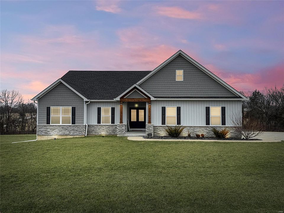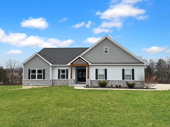 This like-new custom ranch home sits on a beautiful 3-acres m/l corner lot that backs to trees and fence area for your dog. Great location just 25 minutes from Warrenton, Lake St. Louis, and Washington. The open-concept design features a spacious foyer leading to a Great Room, a stunning kitchen with a large quartz island, stainless steel appliances, and a dining area. A covered patio extends your living space outdoors. The main level includes a laundry room with a mudroom, an office/flex space, a spacious primary suite with a walk-in closet and ensuite, two additional bedrooms, a hall bath, and a half bath. The full walkout basement has an egress window and rough-in plumbing for future expansion. The oversized, insulated three-car garage provides ample space for large vehicles and storage. This home combines comfort, style, and convenience—schedule your showing today! Additional Rooms: Mud Room