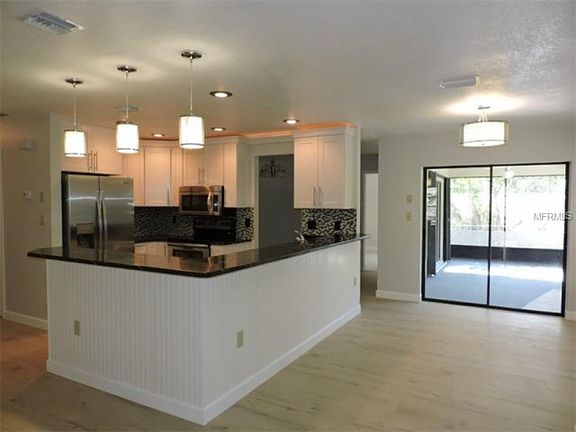 Beautiful Remodeled home on City Water! Features open floor plan with 3 bedrooms, 2 bath, Living/Dining Room, Kitchen with breakfast bar overlooking the family room and breakfast area. Completely remodeled Kitchen with stainless steel appliances , beautiful cabinets with soft close drawers, granite counters, glass tile backsplash, upper cabinet lighting and recessed lighting. New flooring throughout the home. Laminate flooring in Kitchen, Living Room, Family Room and Dining Room. Carpeting in bedrooms and tile in the bathrooms . 3 sets of sliders to the lanai from master bedroom, dining area and breakfast area. Master suite is spacious with 2 walk in closets and bath has updated walk in shower. Guest bedrooms are of generous size and have walk in closets. Guest bath is updated as well. Freshly painted inside and out. New A/C, base board, trim, inside doors and light fixtures. Outside features include patio area, screened in lanai, and fenced in backyard with fruit trees (lemon, grapefruit and mango).