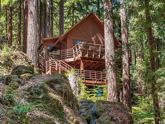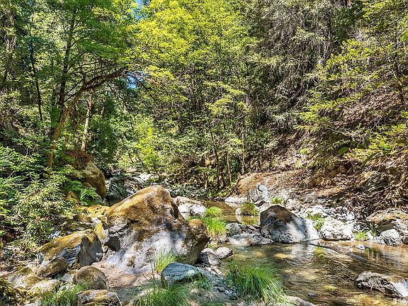 Spectacular Private Sanctuary ~ Peaceful, Quiet, Remote, this one-of-a-kind 1BR + Loft / 2BA Artist Cabin is set in an inspirational park-like setting on 40 acres of jaw-dropping creek frontage that will take your breath away. Rich, heavy timber interiors showcase a volume ceiling, wood stove and loft with custom windows throughout that showcase a continuous theater of nature. Wonderful decks off both the upper living room and lower detached bedroom. Stunning grounds are a study in Northern California wilderness with towering Redwoods, rock outcroppings, waterfalls, creeks and plenty of spots perfect for private or group Glamping. A rare find this close to the Bay Area!