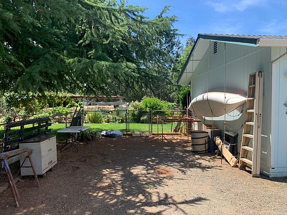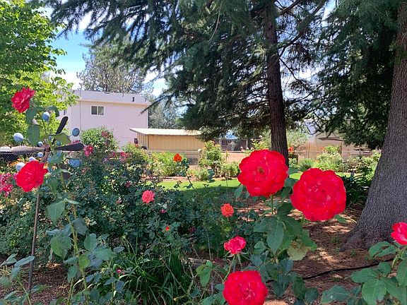 Calling all green thumbs! You won't find a more peaceful acre in town. Shaded pine trees tower over the multitude of rose bushes and meticulous landscape. Fully fenced, woodworking SHOP and plenty of parking. Located near town but in county limits. Well water with a newer pump. Dual pane windows, Budget Blinds throughout, washer/dryer/fridge to stay. Living room has vaulted, wood panel ceilings with a warming wood stove. There are 5 large bedrooms and 3 full bathrooms. All showers have been updated. This home has a newer Aero cooling system that works great and saves money!