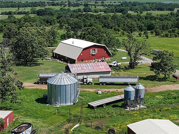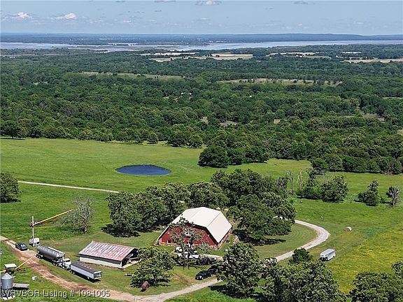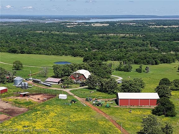A trip to Southeastern Oklahoma on the bluffs overlooking the Canadian River will find you the 2356-acre ranch that is the cattleman and sportsman dream. You can start with the view, which looks over the Canadian River Valley to the west with almost 3 miles of border with the Canadian River and Sequoyah National Wild Life Refuge controlled wildlife area, Kerr Lake to the east, the fields and pastures to the south, the Sans Bois south, and as far east as the World’s Tallest Hill at Poteau and on over to Sugarloaf Mountain in Arkansas over 40 miles distant. Tamaha is just east a little over 3 miles, and the site of the Civil War Steamboat sinking by Col. Stan Watie. History reams in the area. This along with the diversified terrain and vast meadows and pastures sets the stage for the true “Cowboy Ranch”. Improvements infrastructure wise are superb. The lodge style dwelling boasts over 6100 square feet of living area. The rock and cedar décor on the interior were all derived from the ranch. A curved cedar staircase rises to the 2nd floor to a balcony and sitting area and the view to the east, well, you just must see for yourself. 3 br, 2 bath, office, fireplace, mud room and much more. Ranch infrastructure improvements are significant and include: 36X76 horse barn(new), 30X30 lab for cattle processing, 60X100 equipment barn, 40X50 Quonset barn, 2736sq utility building, 2000sq detached carport and numerous other smaller sheds. There is a new feed system with bins and augers allowing for the processing of desired feed right on the ranch. A semi-truck and grain trailer would be available for purchase in addition to the real estate. There is a new state of the art generator connected to the dwelling and essential barns in case of electric failure. A walk-in cooler assures ample storage of direct farm meat sales. This is a great unit that has been managed and developed for an outstanding cattle/recreation ranch.