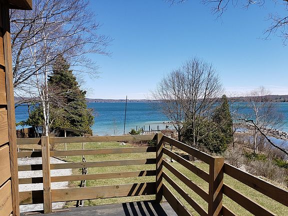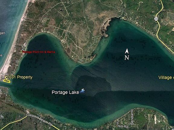 MILLION DOLLAR PROPERTY. A piece of land not often available. This is all about the location. Perfect spot to build your new dream home. Lk Michigan on your west side and Portage Lk, with your beach and dock, to the east side. Watch the sunrise over Portage Lk and Sunset over Lk Michigan. Secluded and spot on the channel. No drive-by traffic. Hidden down a private drive. Looking south across the channel connecting Lk Michigan and Portage Lake and surrounded by a wooded dune on the west and north side. A short path from your front lawn takes you to your private beach and dock on Portage Lake to the east. From your front lawn and deck you have views of Portage Lake and Lake Michigan. Take the path to the west side of your property, a few hundred yards, to miles of sandy beaches on Lk Michig