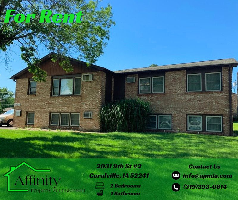 2 Bedroom, 1 Bathroom Apartment located in Coralville. Well maintained, spacious 2 Bedroom apartment in a smaller building. 1 full bathroom. 2 parking spots, coin operated washer and dryer in the building. Tenants responsible for electric. Landlord pays for water, sewer, and trash. Landlord Responsibilities - Utilities and Services: - Lawn Care & Snow Removal - Gas - Water/Sewage/Recycling/Garbage Tenant Responsibilities - Utilities and Services: + Electricity: Approximately $30 per month Pet Details: Pet(s) Allowed: Cats Considered | Updated Vax Records Pet Fee(s): $40 Per Pet/Per Month Pet Deposit: $300 Per Pet Affinity Property Management is proud to offer deposit-free living to qualified renters through Obligo! We understand that moving costs can add up, so we want to extend financial flexibility to our residents. When you move in with us, you can skip paying a security deposit and keep the cash for activities you care about. Additional Disclaimers: *Application Fee(s): $40 Per Adult *Application Process consists of credit and criminal background check, income requirements, and rental reference checks. *Affinity Property Management reserves the right to deny applicants with a previous eviction, unpaid balances, and criminal history.